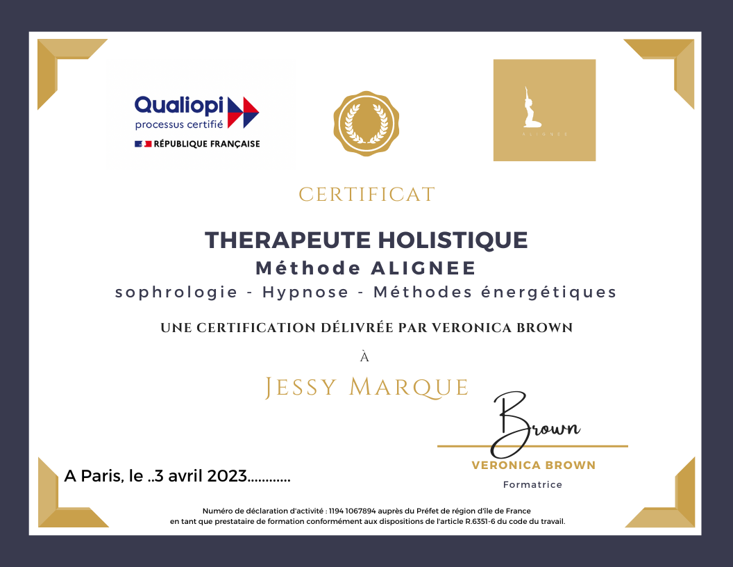 Je suis thérapeute holistique, formée et certifiée à l’Institut Alignée® de Paris, une approche qui associe sophrologie, hypnose douce et méthodes énergétiques.